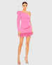 This bold mini dress features a single long sleeve, ruched waist detailing, and a playful feather hem.