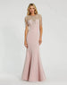 This elegant gown features draped pearls and rhinestone detailing and a dramatic mermaid silhouette, perfect for any black tie wedding or formal event.