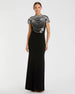 This black evening gown stuns with intricately draped beaded strands that cascade across the bodice, framing the neckline and shoulders in a regal, jewelry inspired design. Crafted from jersey, the sleek silhouette completes the look with timeless elegance, perfect for any formal occasion.