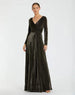 Light-catching Lurex adds sparkle without the weight of beads or sequins. This gorgeous gown is our dream formal pick for fall, fashioned with a surplice bodice, long sleeves and pretty pleats. A high leg slit highlights the swishy, feminine shape of a gown made for getting down on the dance floor — and turning heads.