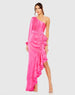 A fashion-forward single-sleeve bodice and flamenco-inspired skirt join forces for a gorgeous special occasion dress. The solid satin design showcases a pleated bodice, one voluminous long sleeve, and flirty flounces that highlight your legs. Add shoulder-sweeping earrings for a summer event.
