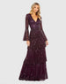 Crafted with an embellished mesh overlay, this gown exudes elegance and sophistication. The tiered ruffle skirt adds a touch of romantic whimsy. The V-neck and long bell sleeves complete the refined and polished look. Perfect for any formal occasion.