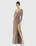 Sleek gown featuring a v-neckline, long sleeves, and a thigh-high slit.