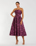 Modern charm meets timeless glamour in this beautiful brocade midi dress. Featuring a strapless neckline, box-pleats, and a classic a-line silhouette, it's the perfect cocktail party dress.