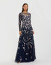 Navy Long Sleeve Floral Embellished Evening Gown