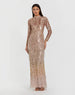 Vintage glamour meets modern detail in this eye-catching embellished gown. Featuring a mock neckline, beaded fringe, and a column silhouette, you're sure to make an entrance in this gorgeous gown.