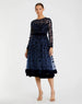 Elegant tea-length cocktail dress with a semi-sheer illusion yoke and sleeves, tulle overlay skirt, and intricate velvet floral accents and beading throughout. A tonal velvet band accents the natural waist, and the skirt is finished with a velvet-trimmed bottom hem.