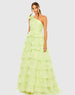 This stunning sheer chiffon gown is feminine, flirty, and fabulous. Styled with a single shoulder frill, a pleated bodice and waistband, and a fluttery tiered skirt, it’s a statement piece for any special occasion. The asymmetrical strappy back adds an unexpected, cool finish to this elegant dress.