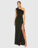 Crafted from crepe fabric for a smooth fit, this one shoulder gown features a sophisticated asymmetrical neckline and a sleeveless design that offers both style. The eye-catching ostrich feather detail on the neckline adds a glamorous touch, while the thigh-high front slit provides a subtle hint of allure. Perfect for formal events and special occasions, this gown combines timeless sophistication with modern flair.