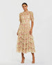 The Beige Lace Trim Printed Mesh High Neck Midi Dress features an illusion high neckline, elbow-length puff sleeves, and cascading ruffle detailing. Its floral print and delicate lace trim add a touch of romantic elegance, perfect for special occasions or a chic daytime event.