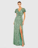 Green Sequined Wrap Over Butterfly Sleeve Draped Gown