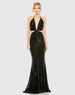 Made to stand out, this eye-catching gown features a daring plunge neckline, side cut-outs, and an open back.