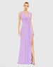 Comfortable. Elegant. Glamorous. This sleek jersey gown is everything to us. Designed with a wrap-style bodice, the dress is fashioned with texture-enhancing gathers that surround a waist twist and round, rhinestone buckle. The dress has a sexy leg slit that creates easy movement and a simple, clean-lined back finished with a concealed zip closure.