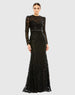 Crafted from embroidered fabric, this elegant gown features a partially lined bodice, a fully lined skirt, and unlined sleeves. The illusion high neckline and long sleeves exude sophistication, while the beaded waist detail adds a subtle touch of glamour. Perfect for formal events and special occasions.