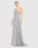 This gown in features a hand embellished mesh overlay. The floral pattern is composed of hand-stitched beads and chevron sequins, making it a unique and elegant choice for any formal occasion.