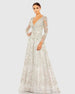 This elegant A-line gown features a hand-embellished embroidered overlay. With a partially lined bodice and fully lined skirt, the sheer unlined sleeves add a touch of romance. The V-neck and faux wrap bodice provide a flattering silhouette, while the all over heat-set jeweled embellishments add a touch of glamour. Perfect for a special occasion, this gown is sure to make you feel confident and stylish.