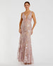 This elegant gown features a plunging illusion neckline with a sheer mesh inset, a scoop back, and a flattering fit-and-flare silhouette. The mesh overlay is adorned with allover embroidery, 3D floral appliqué, and heat-set crystals, adding a touch of glamour. A beautiful hand-beaded belt accentuates the natural waist.