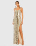 Crafted from embellished fabric, this gown exudes elegance. The scoop neckline adds a touch of sophistication while the thigh-high slit offers a daring element. Perfect for any formal occasion, this gown will make you stand out with its detailed back and flattering fit.