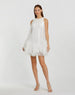 This playful design starts with a mini sheath featuring cutaway shoulders and neckline embroidery. A trapeze-cut layer of tulle adorned with oversized floral poufs tops the leggy underlay for a look that’s modern, youthful, and oh-so-chic. Highlight the flirty hem with lengthening stilettos.