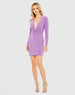 Mini dress featuring a plunge neckline, long sleeves, and a ruched faux bow bodice.