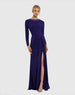 Purple Long Sleeve Jersey Ruched Gown With Beaded Neck