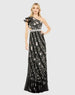 This gown showcases intricate embroidery, a ruffled sleeve, lace-up back, and a floral beaded waist for a glamorous touch.