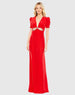 Form-fitting column gown with short puff sleeves and intricately beaded front cutouts.