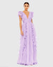 This elegant chiffon gown features a flattering v-neckline, playful ruffle cap sleeves, and gorgeous ruffle detailing throughout.