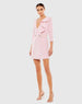 Crepe mini dress with plunging v-neckline, 3/4 length sleeves, and ruffle bodice detail.