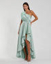This stunning gown is crafted from metallic-infused charmeuse, it features an asymmetrical one shoulder neckline, ruffle shoulder detailing, and a hi-low hem, making it the perfect look for any special occasion.