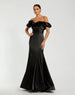 Crafted from luxurious satin fabric, this gown features an elegant ruffled off-the-shoulder neckline and flattering mermaid silhouette.