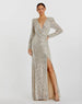 Long sleeve sequined gown with, v-neckline, long sleeves, ruched bodice, and a thigh-high slit.