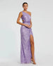 Embrace luxury in our Sequined One Shoulder Draped Lace Up Gown. Made with sparkling sequin fabric, this gown features an asymmetrical neckline, daring thigh high slit, and an alluring lace up back, sure to make you stand out in any crowd.