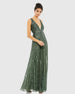 This elegant gown features a sequined mesh overlay for a glamorous look. The plunging neckline, mesh bust inset, and sleeveless design create a flattering silhouette. With vertical rows of sequins that catch the light, this gown is perfect for formal events or a night out.