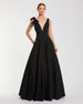 This elegant crepe ballgown features a plunging neckline, bow detail on the shoulder, and practical pockets, blending timeless sophistication with modern flair. Perfect for weddings and special occasions.