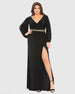 Elegant floor-length gown with a faux-wrap v-neckline, gathered waist, long split sleeves, and a thigh-high slit. A hand-embellished belt defines the natural waist.